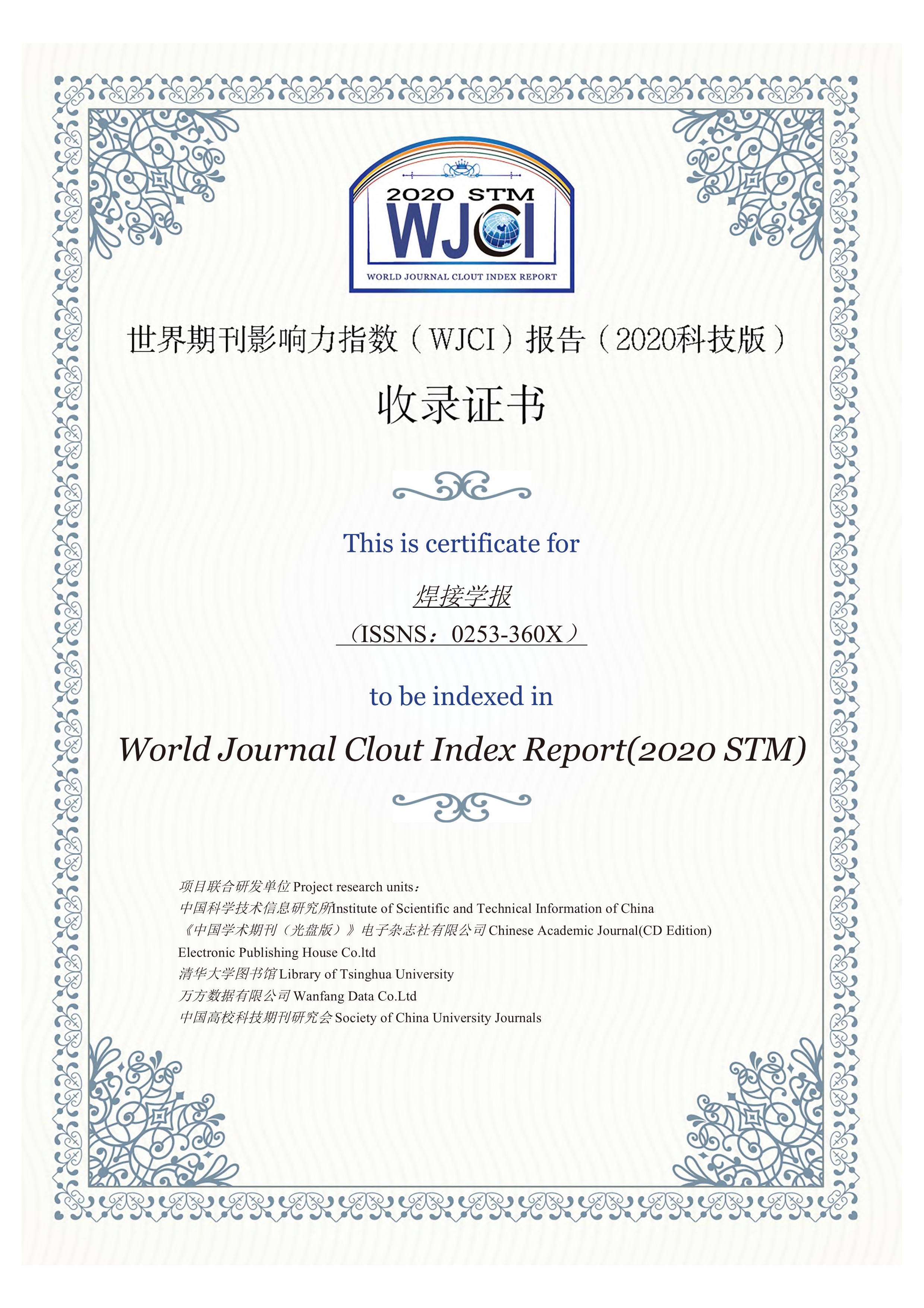 近日,《世界期刊影響力指數(WJCI)報告(2020STM)》發布,《焊接學報》以其較高的學術影響力及行業認可度成功入選。