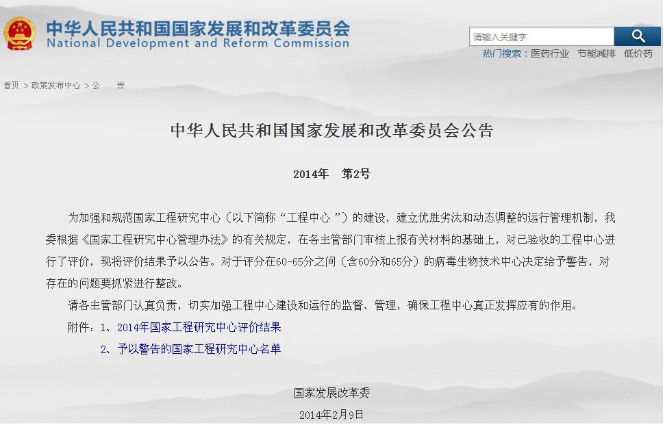 2011-2012年度國家工程研究中心評價工作,從2013年3月展開,經過專家組近一年的綜合評審工作,于2014年2月由國家發改委2號公告(見圖2)宣布評價結果,哈爾濱焊接研究所高效焊接新技術國家工程研究中心,由上屆86個國家級中心參評排名63,到本屆90個國家級中心參評排名27,獲得有史以來排名最前的佳績,取得80.3分,爭得申報國家重大項目的優先權。此次成績的獲得是國家投資給我們搭建了展示的平臺,與中心創新能力建設項目息息相關。