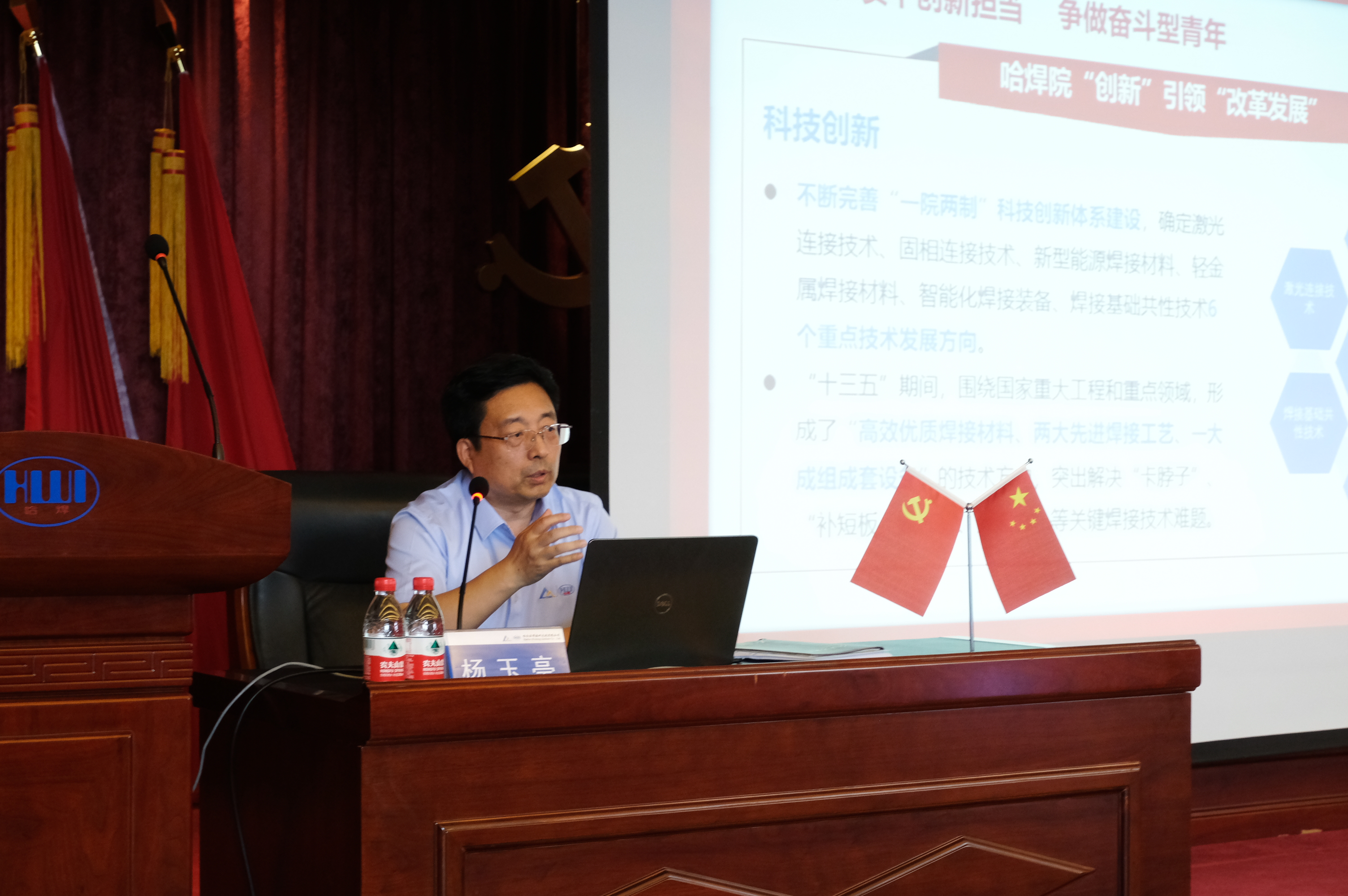 楊玉亭書記首先對習近平總書記“七一”重要講話精神及總書記在2021年中央黨校(國家行政學院)中青年干部培訓班開班式上的講話進行了宣講,引領青年回顧學習重要講話精神,堅定信仰引航奮斗人生,筑牢思想政治基礎,渲染青春底色。隨后,圍繞“把握政治建設內涵 凝聚干事創業力量”,結合學習總書記關于加強思想政治建設的重要論述,激勵廣大青年干部堅定理想信念,加強政治建設,在不斷的學習與鍛煉中提升自己的干事創業能力,以實際行動投身改革創新浪潮。最后楊書記結合哈焊院“創新”引領“改革發展”歷程及自身成長經歷,深刻闡釋了“使命擔當,青年任重道遠;機會空前,青年大有可為”,并對哈焊青年提出深切勉勵和殷切希望,號召廣大青年:堅定理想信念 爭做學習型青年;實干創新擔當 爭做奮斗型青年;嚴格紀律約束 爭做先進型青年。