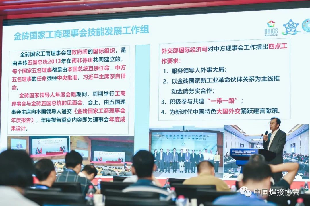 北京嘉克新興科技有限公司董事長劉振英博士做題為《深化金磚國家人才培養(yǎng)成果與展望》的報(bào)告。報(bào)告從金磚大賽的發(fā)展歷程,主辦承辦的各類賽事,推進(jìn)國家技能訓(xùn)練基地建設(shè)、實(shí)施“技能護(hù)照”計(jì)劃、舉辦技能發(fā)展與技術(shù)創(chuàng)新系列大講堂、成立未來技能發(fā)展與技術(shù)創(chuàng)新研究院、緊密與國際組織合作等幾個(gè)方面進(jìn)行了詳細(xì)的介紹,這些工作扎實(shí)有效的提高了我國焊接事業(yè)在國際舞臺(tái)的影響力與話語權(quán)。